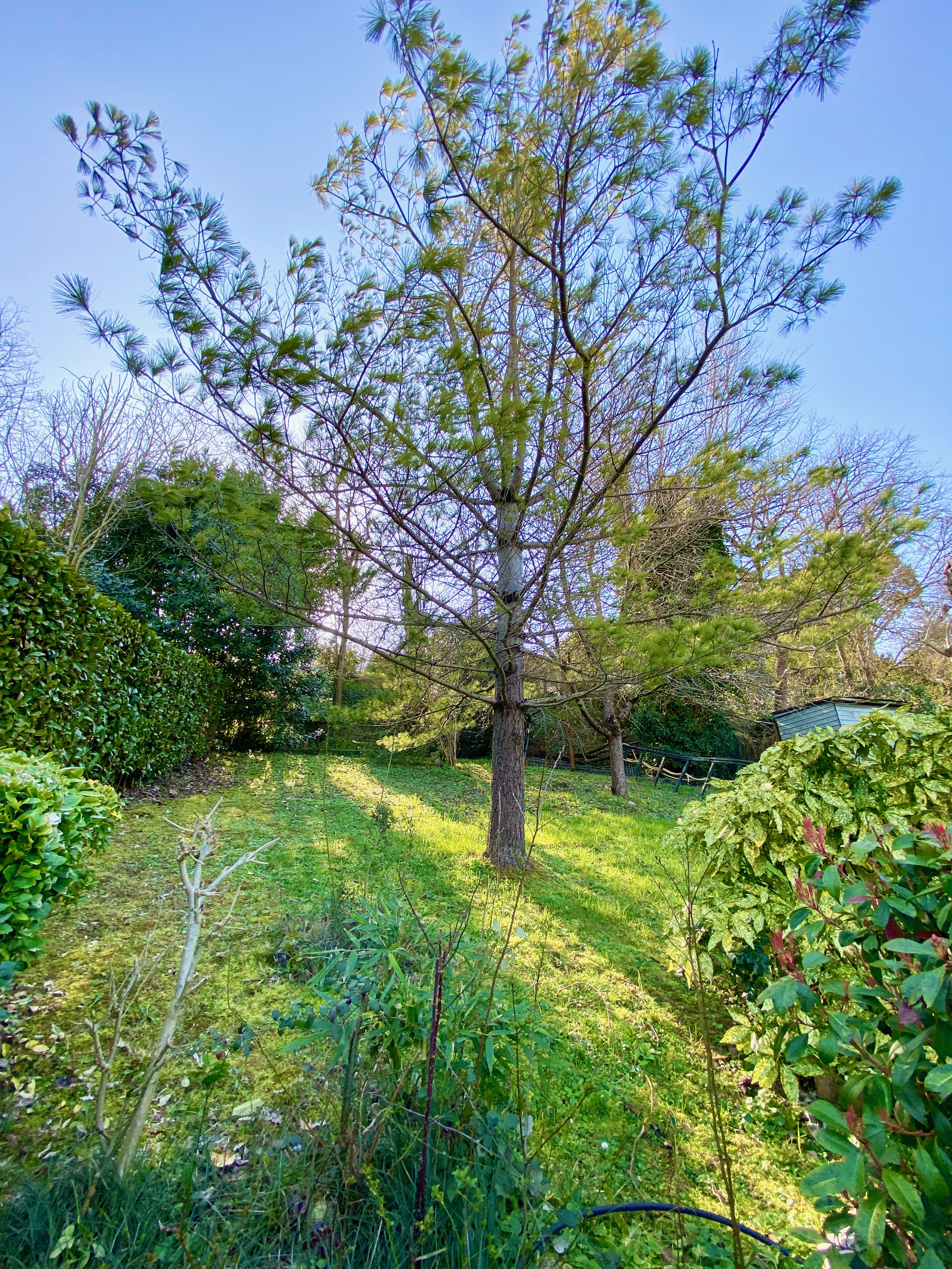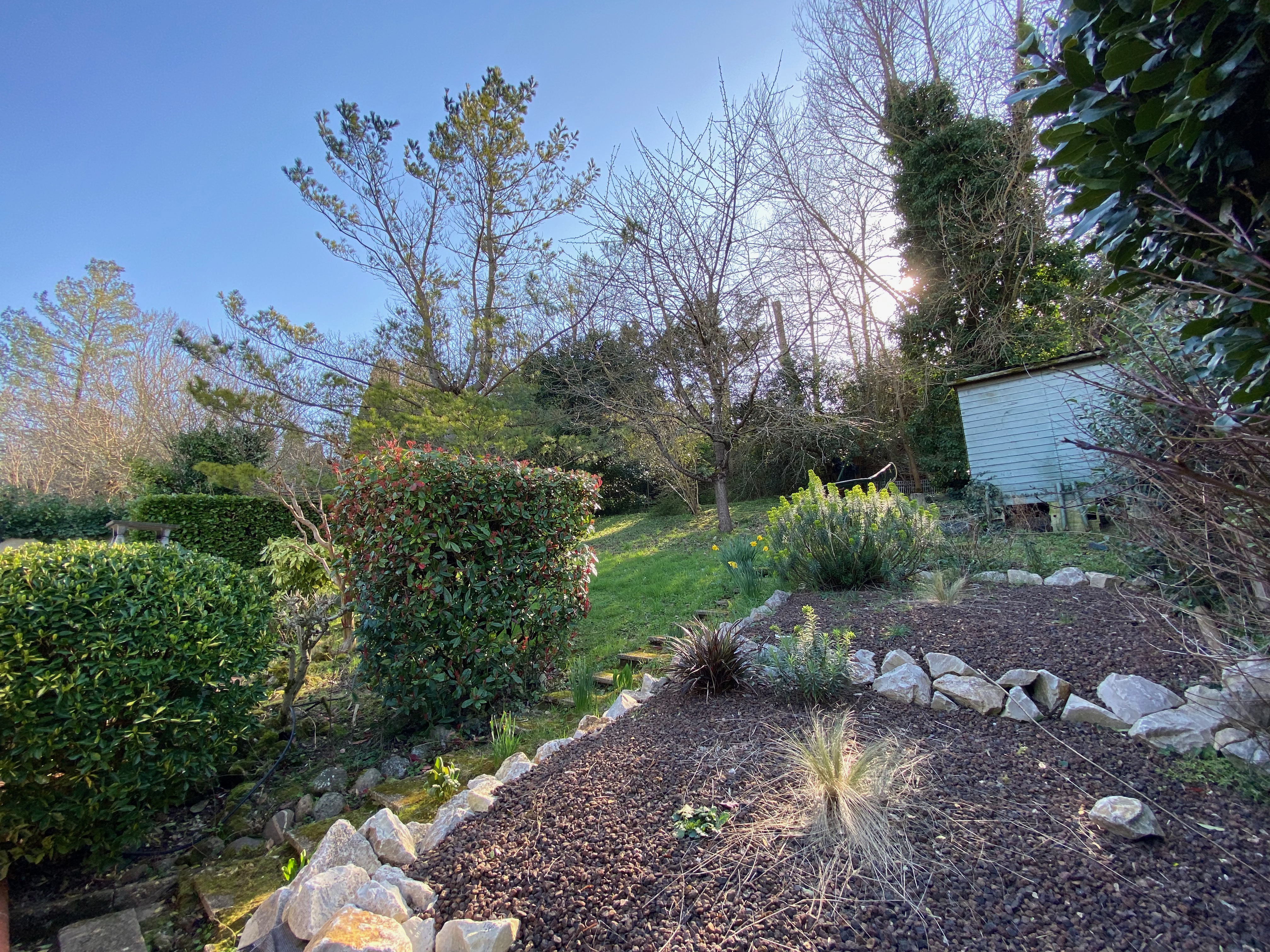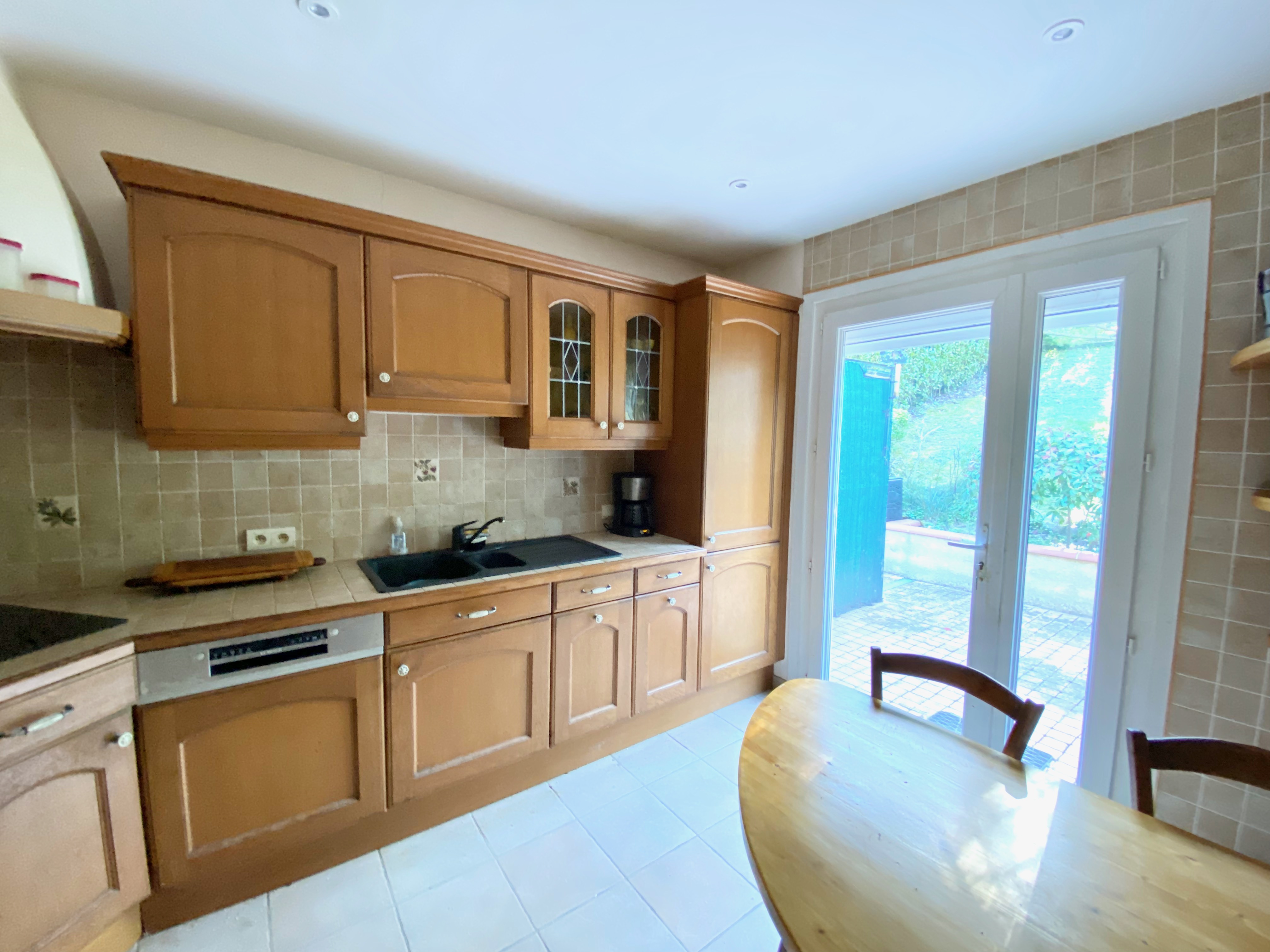 A l’extérieur, terrasse, barbecue et solarium à l’arrière de la maison, à hauteur du premier étage, jardin arboré entourant la maison, possibilité de stationner à l’avant.