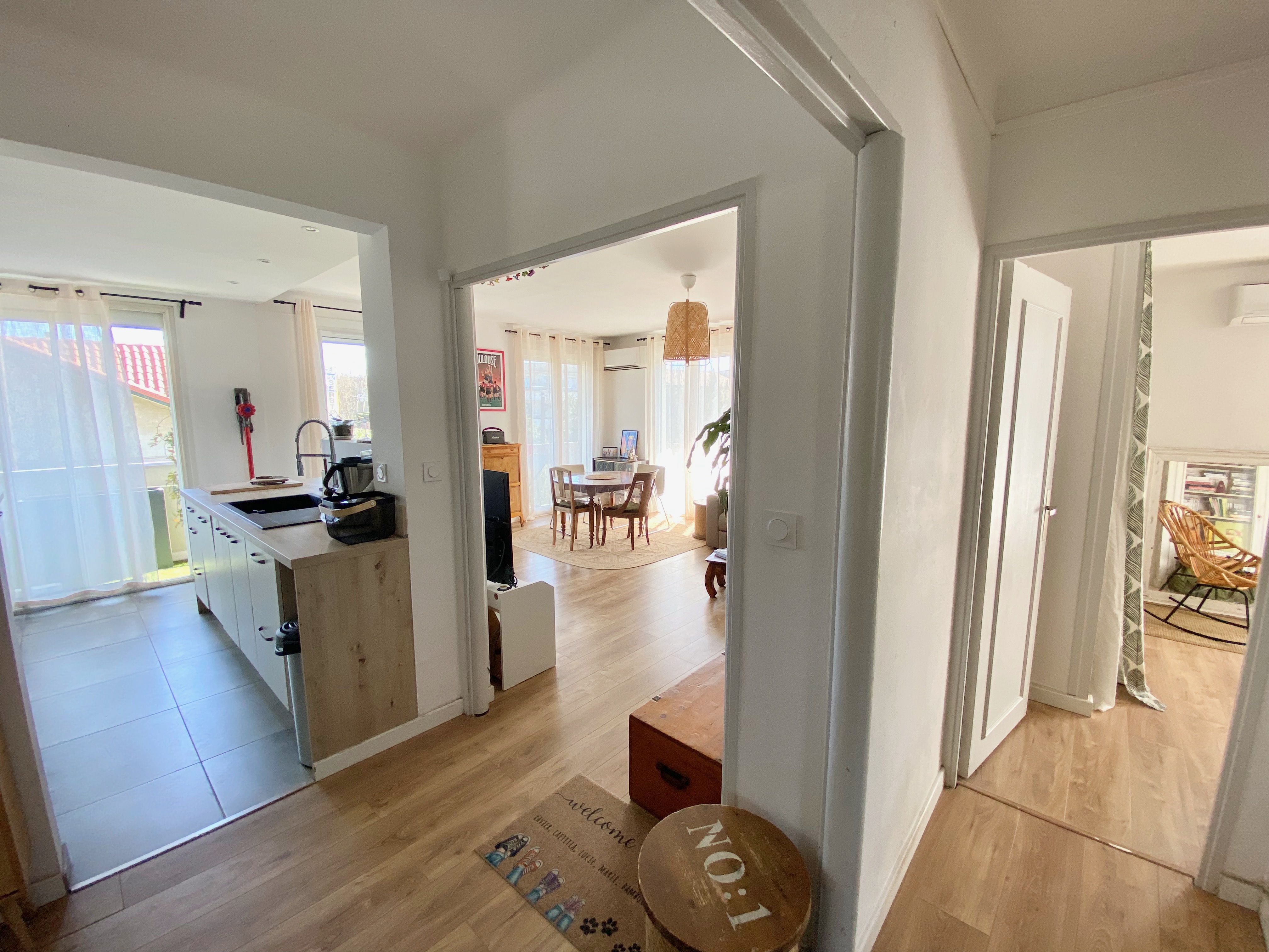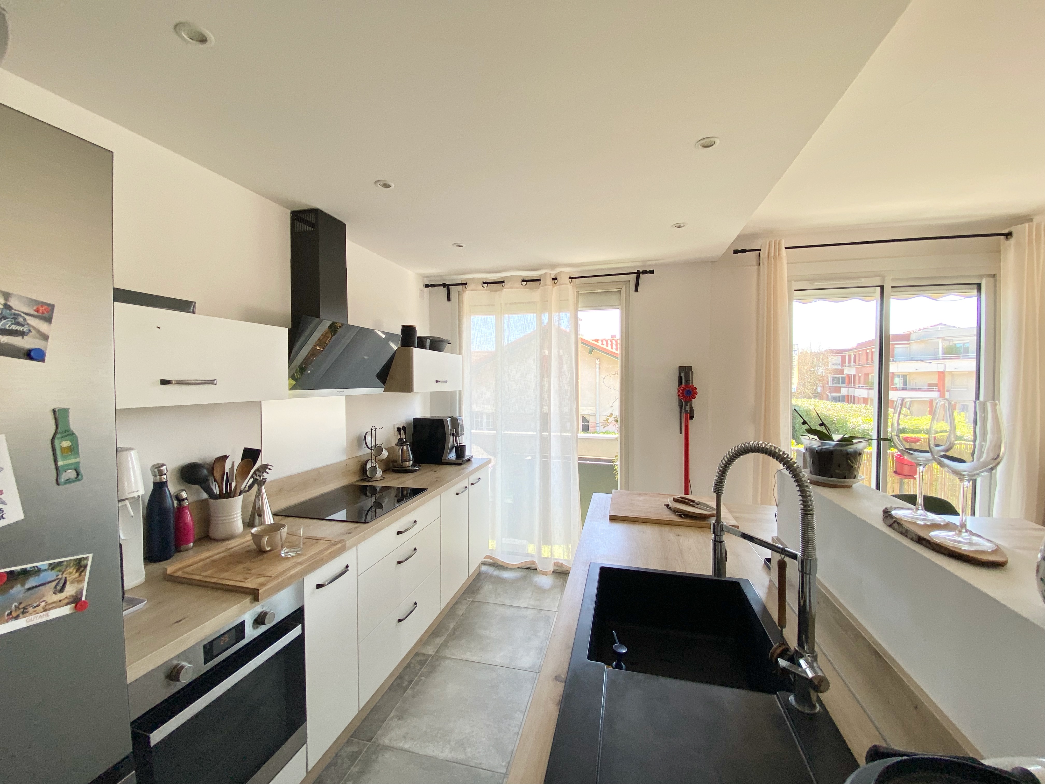 Vaste entrée avec placards, superbe pièce de vie proposant une cuisine ouverte et un accès sur un balcon en angle exposé Sud et Est.
