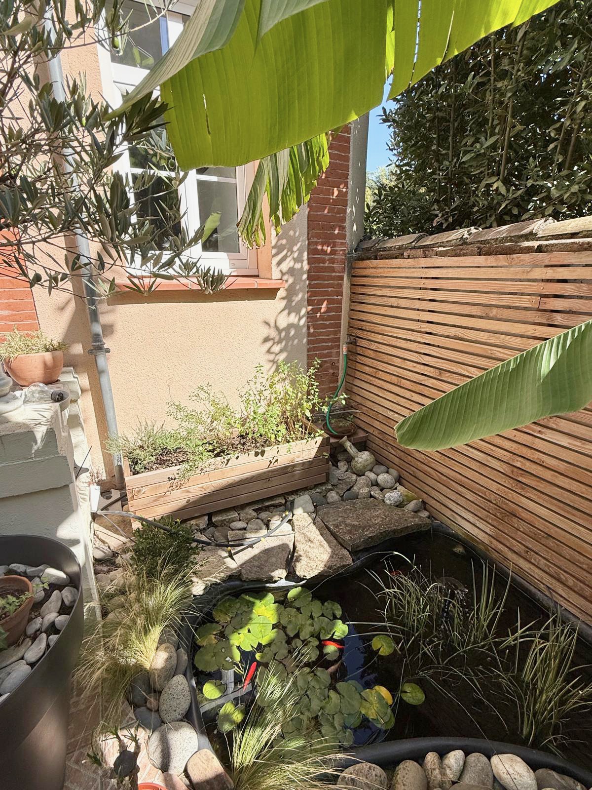 L’extérieur se compose d’un ravissant jardin d’agrément sans vis-à-vis, avec terrasse, espace végétalisé, joli bassin à poissons et un stationnement sécurisé.